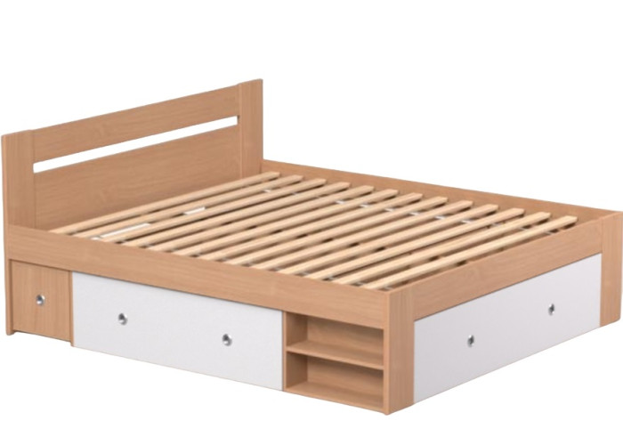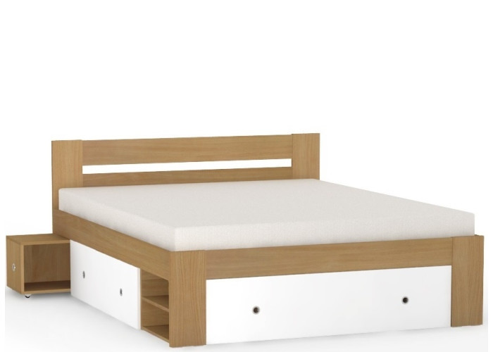 Manželská posteľ zahŕňa: korpus postele + 2ks výsuvných nočných stolíkov + 3 ks výsuvných úložných priestorov + 2 ks odklacích políc.