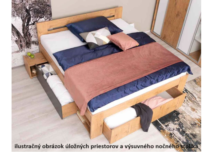 Manželská posteľ zahŕňa: korpus postele + výsuvný nočný stolík (1ks) + výsuvný úložný priestor (2ks) + polica 1 ks.
