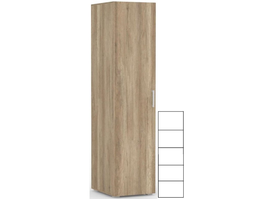 Policová skriňa REA VENEZIA 1 do spálne je ideálnym úložným priestorom na oblečenie, do ktorejkoľvek časti spálňovej steny zo sektorového nábytku REA VENEZIA. Skriňa má vo vnútri celkom štyri police a úložný priestor je rozdelený na päť rovnakých častí. Policová skriňa má univerzálne otváranie dverí, t.j. otvárať dvere je možné ako sprava doľava, tak aj zľava doprava. Pánty dverí skrine je možné pripevniť na ľavej alebo pravej strane. Šatníková skriňa do spálne je vyrobená z laminovanej drevotrieskovej dosky.