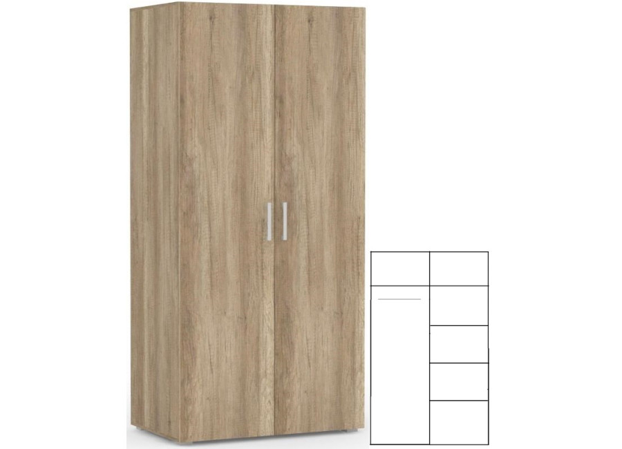 Vešiaková skriňa REA VENEZIA 2 do spálne je ideálnym úložným priestorom na obleky, nohavice, košele alebo večerné šaty, do ktorejkoľvek časti spálňovej steny zo sektorového nábytku REA VENEZIA. Vešiaková skriňa má vo vrchnej časti policu, ktorá poskytuje úložný priestor na oblečenie. Je delená na polovicu, ľavá je určená na vešanie vecí.. pravá strana je policová. Vešiaková skriňa do spálne je vyrobená z laminovanej drevotrieskovej dosky.