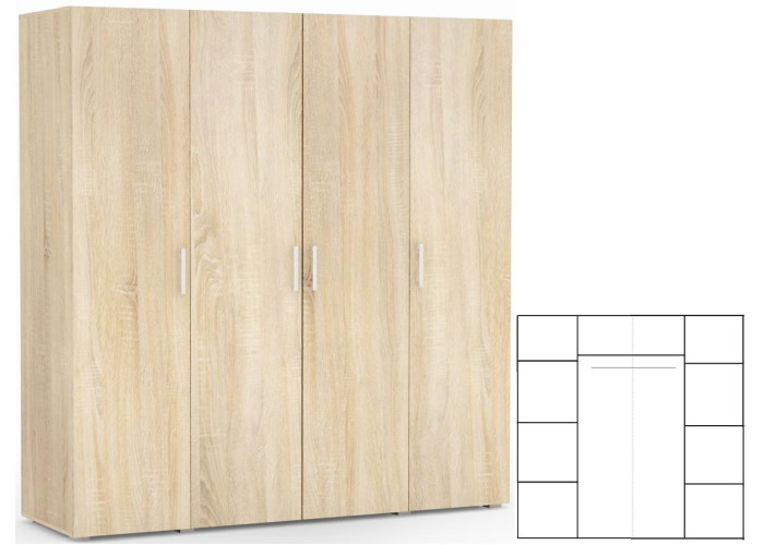 Kombinovaná skriňa REA VENEZIA 4 do spálne je vhodná ako úložný priestor na obleky, nohavice, košele, večerné šaty, ale aj na tričká, svetre atd. do ktorejkoľvek časti spálňovej steny zo sektorového nábytku REA VENEZIA. Šatníkovo-vešiaková skriňa je štvordverová, dvojkrídlové dvere v strede sa otvárajú jedny doľava a druhé doprava. Bočné dvere vľavo od vešiakovej časti sa otvárajú doľava. Bočné dvere vpravo od vešiakovej časti sa otvárajú doprava. Vešiaková časť skrine má vo vrchnej časti policu, ktorá poskytuje úložný priestor na oblečenie. Kombinovaná skriňa do spálne je vyrobená z laminovanej drevotrieskovej dosky.