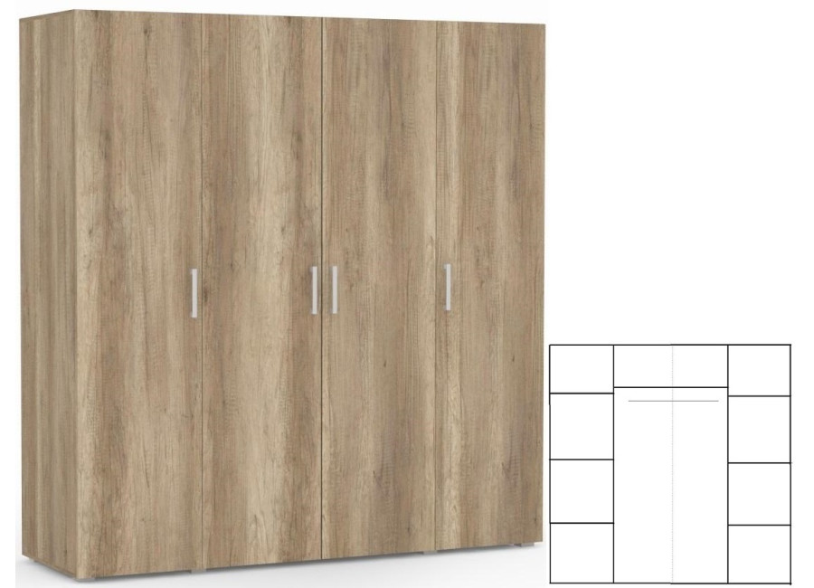 Kombinovaná skriňa REA VENEZIA 4 do spálne je vhodná ako úložný priestor na obleky, nohavice, košele, večerné šaty, ale aj na tričká, svetre atd. do ktorejkoľvek časti spálňovej steny zo sektorového nábytku REA VENEZIA. Šatníkovo-vešiaková skriňa je štvordverová, dvojkrídlové dvere v strede sa otvárajú jedny doľava a druhé doprava. Bočné dvere vľavo od vešiakovej časti sa otvárajú doľava. Bočné dvere vpravo od vešiakovej časti sa otvárajú doprava. Vešiaková časť skrine má vo vrchnej časti policu, ktorá poskytuje úložný priestor na oblečenie. Kombinovaná skriňa do spálne je vyrobená z laminovanej drevotrieskovej dosky.