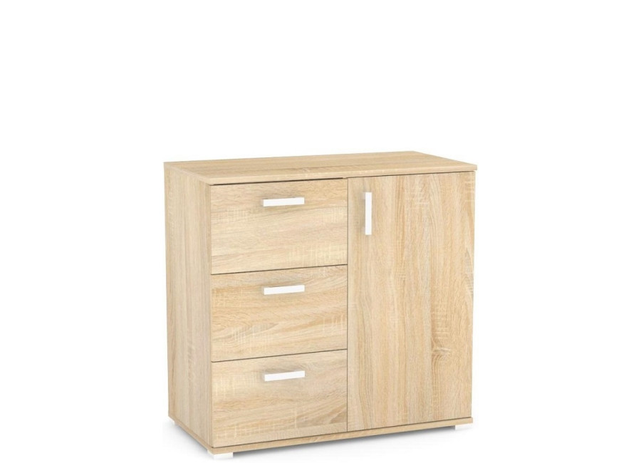 Komoda REA SISA 2 ponúka tri praktické zásuvky a dvierka do ktorejkoľvek miestnosti v domácnosti. Šikovná komoda je vyrobená z kvalitnej laminovanej drevotrieskovej dosky. V dvierkovej časti komody je jedna polica.