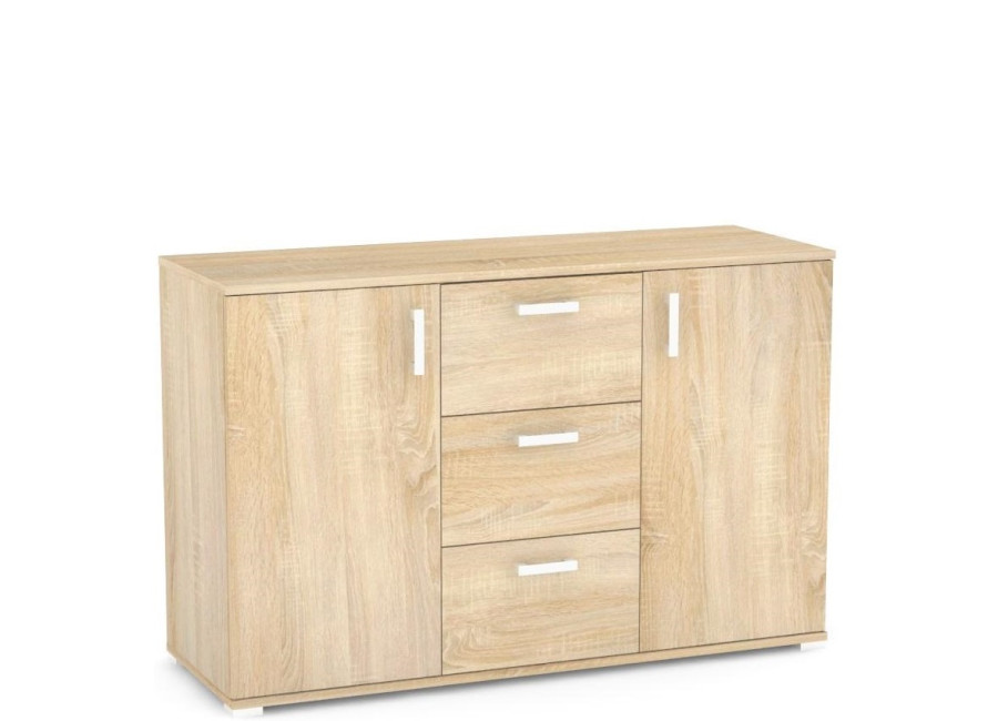 Komoda REA SISA 4 pozostáva z troch zásuviek, naboku sa nachádzajú dve dvierka, ktoré sú vo vnútri rozdelené na dve časti jednou poličkou. Komoda REA SISA 4 je vhodná do každej miestnosti - do spálne, do obývačky, do detskej izby, do predsiene, kuchyne alebo do haly. Komoda je vyrobená z kvalitnej laminovanej drevotrieskovej dosky.