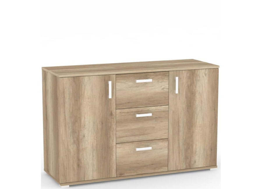 Komoda REA SISA 4 pozostáva z troch zásuviek, naboku sa nachádzajú dve dvierka, ktoré sú vo vnútri rozdelené na dve časti jednou poličkou. Komoda REA SISA 4 je vhodná do každej miestnosti - do spálne, do obývačky, do detskej izby, do predsiene, kuchyne alebo do haly. Komoda je vyrobená z kvalitnej laminovanej drevotrieskovej dosky.