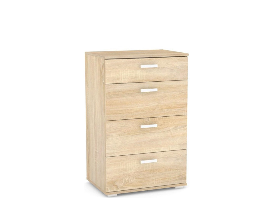 Komoda REA SISA 10 má 4 zásuvky, využiť je ju možné v obývacej izbe, detskej izbe, hale či kuchyni. Je vyrobená z kvalitnej laminovanej drevotrieskovej dosky.