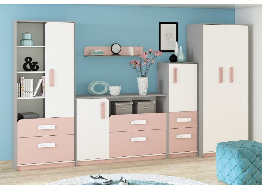 IQ púdrová je farebná detská kolekcia nábytku. Je vyrobená z kvalitnej laminovanej drevotriesky odolnej voči mechanickému poškodeniu a poškrabaniu. Vyberte si zo sektorových skriniek a zariaďte deťom  izbu unikátnym nábytkom.