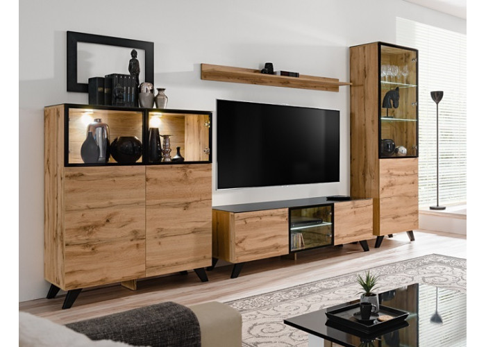 Nábytok Thin je vyrobený z kvalitnej laminovanej drevotriesky. Štýlovo je určený do moderných obývacích izieb. Charakteristickým prvkom sú čierne nohy a horné dosky skriniek. V cene skriniek je LED osvetlenie a spomaľovače na dvierka.