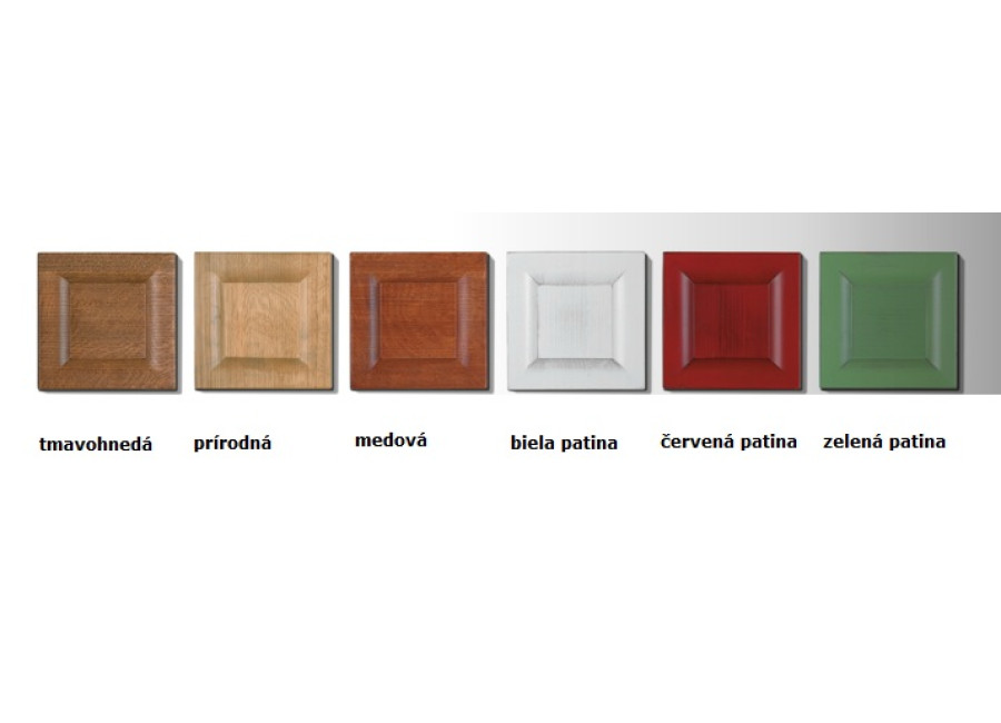 | Morenie dreva | prírodné, tmavohnedá, medová, biela patina, zelená patina, červená patina |