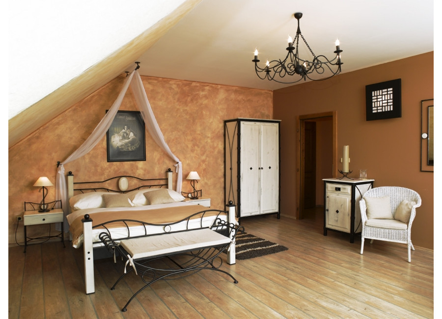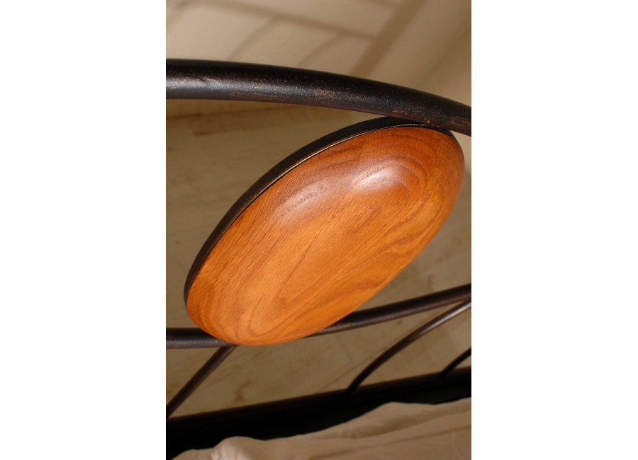 Posteľ STROMBOLI je ručne kovaná z masívneho železa, drevené prvky sú z masívneho dubu.