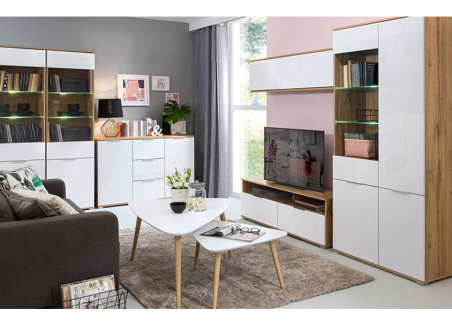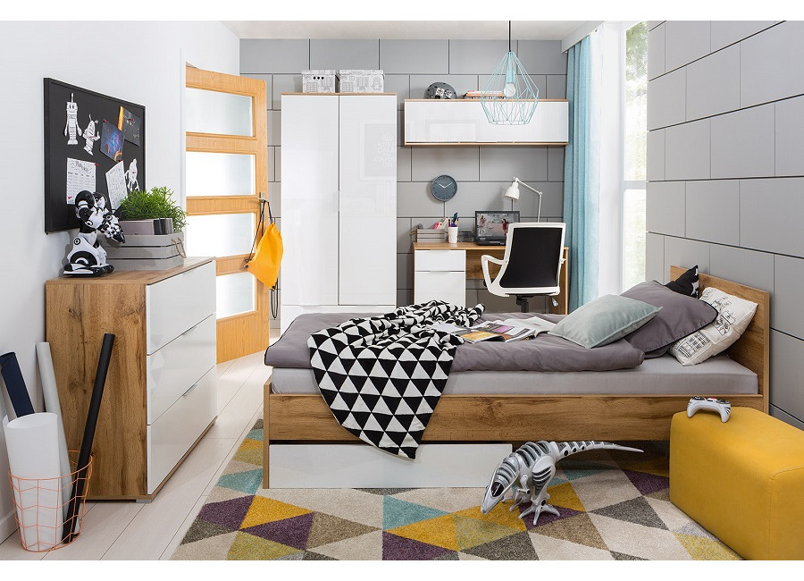 Nábytok ZELE sa vyznačuje jednoduchým dizajnom s minimalistickými úchytkami. Vyrába sa v obľúbenej farbe dub wotan v kombinácií s bielym leskom.