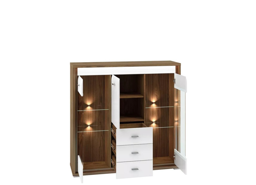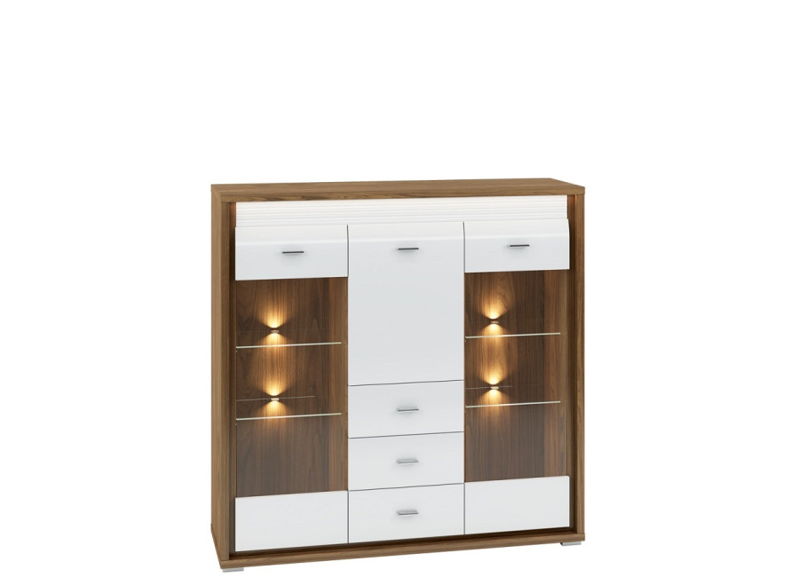 Nábytok DALLAS má luxusný dizajn. Farba prírodného orechu a bieleho lesku dodáva interiéru eleganciu a sviežosť. DALLAS má charakteristické predné čelné drážkované panely vo farbe biely lesk, ktoré mu dodávajú eleganciu a exkluzivitu.
