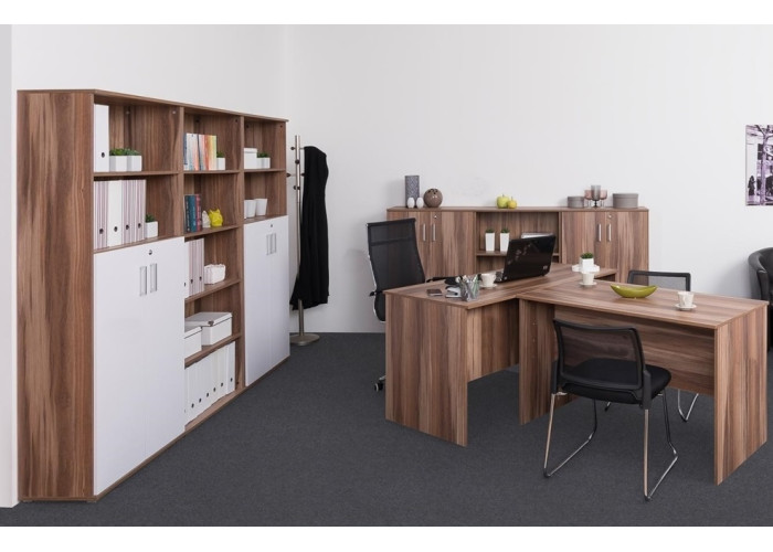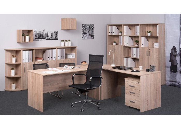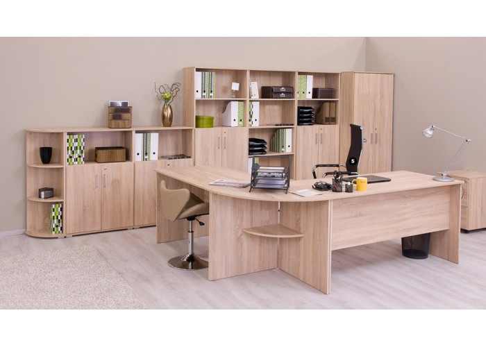 Sektorový kancelársky nábytok REA OFFICE si môžete objednať v mnohých farebných variáciách. Vybrať si môžete farbu korpusu aj farbu dvierok. Nábytok REA OFFICE má kovové úchytky, skrinky majú regulovateľné nožičky a sú uzamykateľné. Hrany sú olepené 0,5mm (korpusy) a 1mm ABS hranou (pláty stolov a dvierka). Kancelársky nábytok REA OFFICE je veľmi dobrou voľbou na zariadenie kancelárie v modernom a funkčnom štýle.