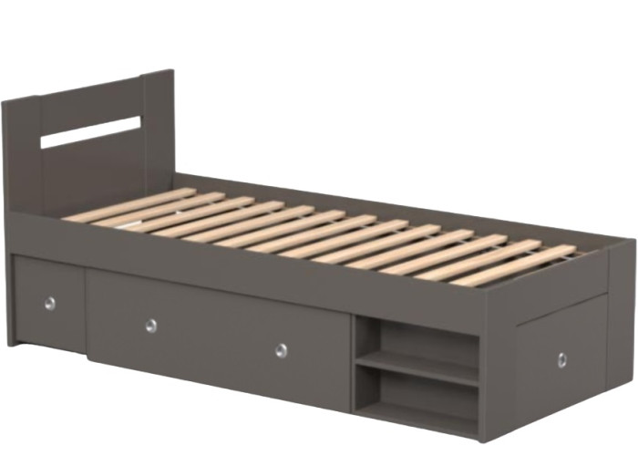 Posteľ zahŕňa: korpus postele + výsuvný nočný stolík (1ks) + výsuvný úložný priestor (2ks) + polica 1 ks.