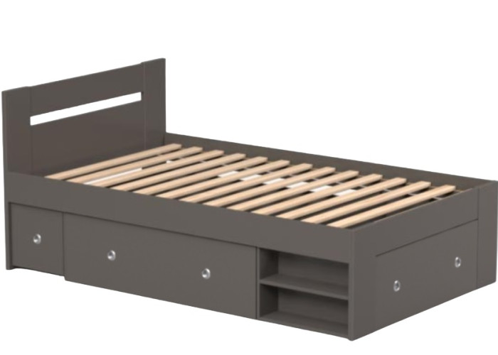 Posteľ zahŕňa: korpus postele + výsuvný nočný stolík (1ks) + výsuvný úložný priestor (2ks) + polica 1 ks.