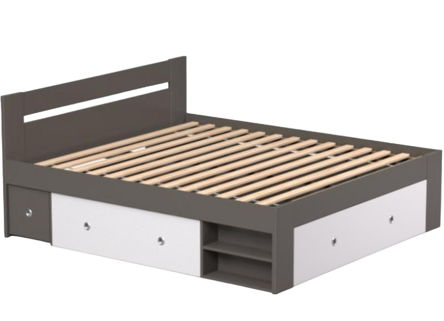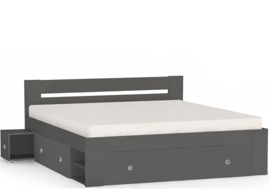 Manželská posteľ zahŕňa: korpus postele + 2ks výsuvných nočných stolíkov + 3 ks výsuvných úložných priestorov + 2 ks odklacích políc.