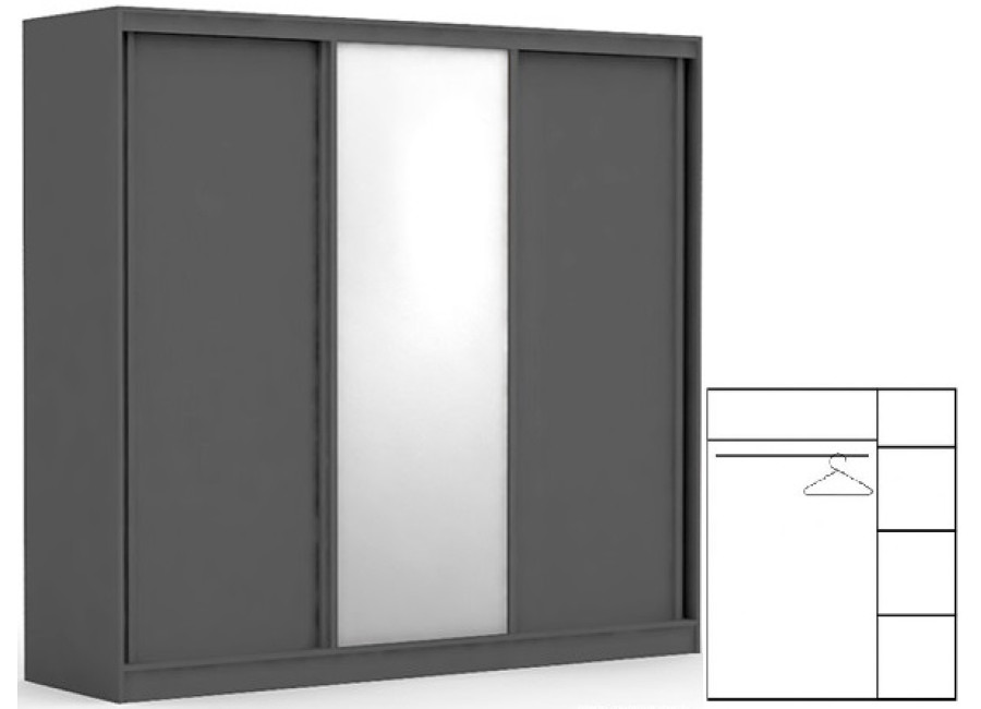 Zrkadlová skriňa REA ATLANTA 3 s posuvnými dverami a zrkadlom je určená do každej miestnosti v byte alebo dome. Úložné priestory skrine sú rozdelené na dve časti. Pravá časť skrine je policová a je rozdelená na štyri rovnaké časti. Ľavá časť skrine umožňuje zavesiť oblečenie na vešiakovú tyč, nad ktorou sa nachádza polica, do ktorej je možné uložiť menej používané šatstvo. Korpus šatníkovej skrine je uzatvárateľný praktickými tromi posuvnými dverami. Stredné dvere sú so zrkadlom.