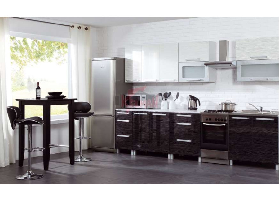 Moderná sektorová kuchyňa MERLIN v jedinečnom dizajne zaujme najmä svojimi striebornými dekoračnými žilkami na dvierkach pri oboch farbách: bielom aj čiernom lesku. Korpus skriniek sa dodáva v sivej farbe. Vyskladajte si kuchyňu podľa Vašich predstáv.