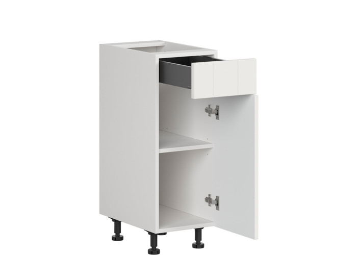 Mimoriadnou výhodou tejto skrinky je zásuvka s plnovýsuvom, ktorá disponuje tenkou a elegantnou bočnicou so šírkou len 12,8 mm. Samozrejmosťou je technológia tichého zatvárania so spomaľovačom pre tichý a plynulý chod. Vylepšená synchronizácia mechanizmu zaručuje rovnomerný ťah, zásuvka je zároveň prakticky nastaviteľná – čielko môžete vycentrovať nielen do strán, ale i vo vertikálnom smere a dokonca aj jeho sklon. Pre maximálne prispôsobenie vašej kuchyne je možné si pri tejto skrinke zvoliť orientáciu otvárania dvierok – vľavo alebo vpravo podľa vašej potreby. Kuchynská skrinka je preto univerzálnou voľbou nielen do rovných, ale aj do rohových kuchýň.