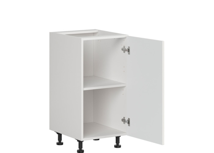 Biela kuchynská skrinka má nastaviteľné nožičky s výškou 10 cm, ktoré zjednodušujú prispôsobenie nerovnostiam podlahy a ponúka jednu praktickú policu pre uloženie riadu či potravín. Dvierka je možné osadiť na ľavé alebo pravé otváranie.