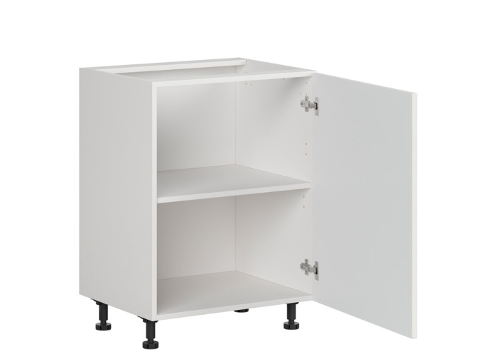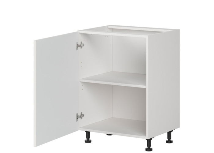 Biela kuchynská skrinka má nastaviteľné nožičky s výškou 10 cm, ktoré zjednodušujú prispôsobenie nerovnostiam podlahy a ponúka jednu praktickú policu pre uloženie riadu či potravín. Dvierka je možné osadiť na ľavé alebo pravé otváranie.