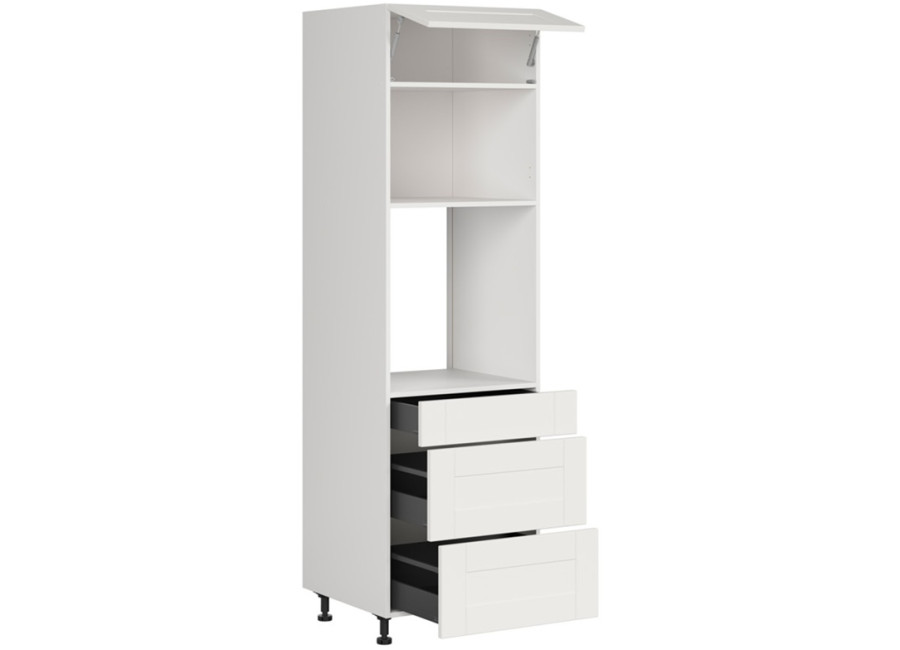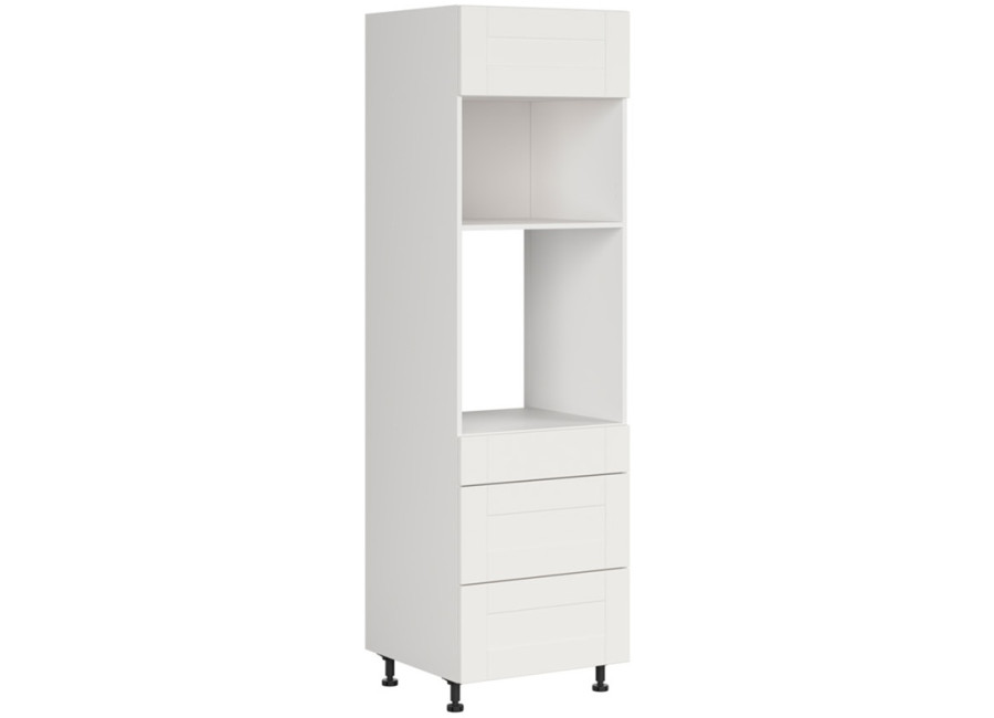 Pri výrobe tejto skrinky bol použitý korpus z laminovanej drevotriesky dostupnej v niekoľkých farebných variantoch. Predné dvierka sú z MDF materiálu vo farbe biely canadian. Skrinka je určená na vstavanú rúru a mikrovlnku a súčasťou sú tri zásuvky s plnovýsuvom a tlmením – ideálne na prehľadné usporiadanie kuchynských potrieb.
