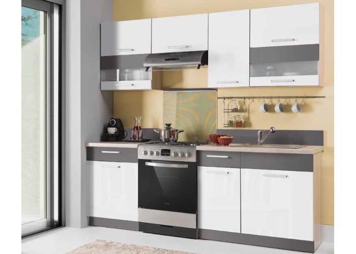 Kuchynská linka MODENA zaujme na prvý pohľad svojím moderným farebným prevedením biely lesk a grafit, ktoré sa ľahko kombinuje s ostatným interiérom. Plynové piesty na horných skrinkách sú príkladom praktickosti, ktorá zjednodušuje otváranie a zatváranie skriniek.