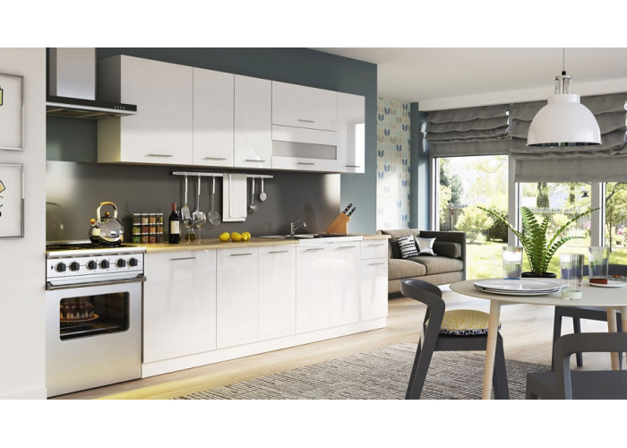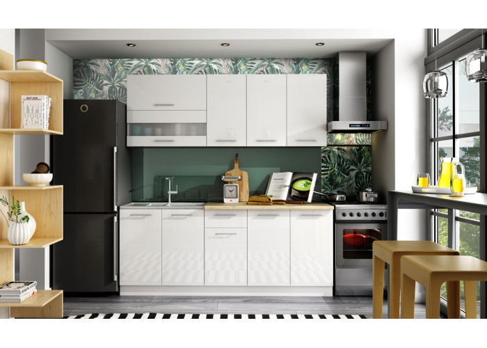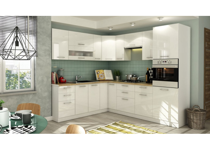 Sektorová kuchyňa TIFFANY Vám ponúka vysokú kvalitu za rozumnú cenu. Kuchynské skrinky majú závesy s tichým zatváraním, zásuvky Metalbox ponúkajú vysokú nosnosť, výklopné skrinky majú plynové piesty, úchytky sú kovové. Dvierka sú vyrobené z kvalitného MDF materiálu, farebná kombinácia biela/biely lesk sa hodí do všetkých moderných interiérov.