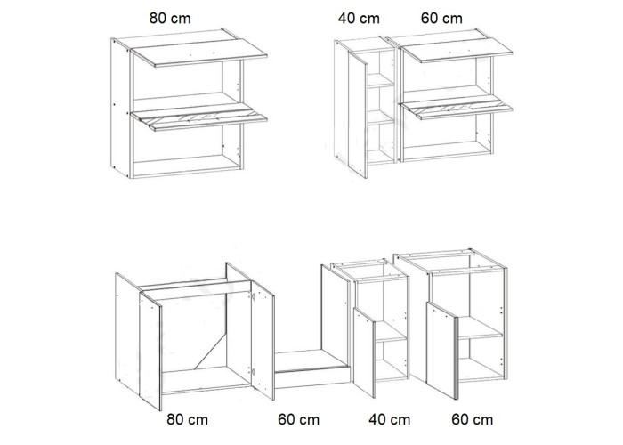 Kuchyňa MODENA poskytuje vysokú kvalitu za rozumnú cenu. Skrinky sú vyrobené z kvalitnej laminovanej drevotriesky ohranované ABS hranou. Zásuvky majú kovové METABOXY, na ktoré je možné zakúpiť spomaľovače. Horné výklopné skrinky majú plynové piesty. Vyskladajte si sektorovú kuchyňu podľa vlastných predstáv. Súčasťou akciového kompletu je aj pracovná doska Travertín v dĺžke 240 cm.