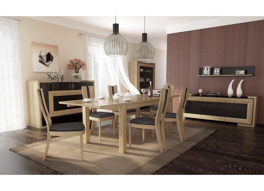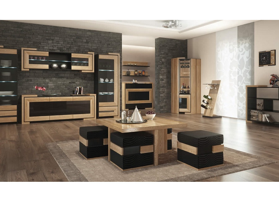 | Materiál | doska MDF s prírodnou dubovou dýhou, dubový masív, laminovaná drevotrieska, čierne sklo |