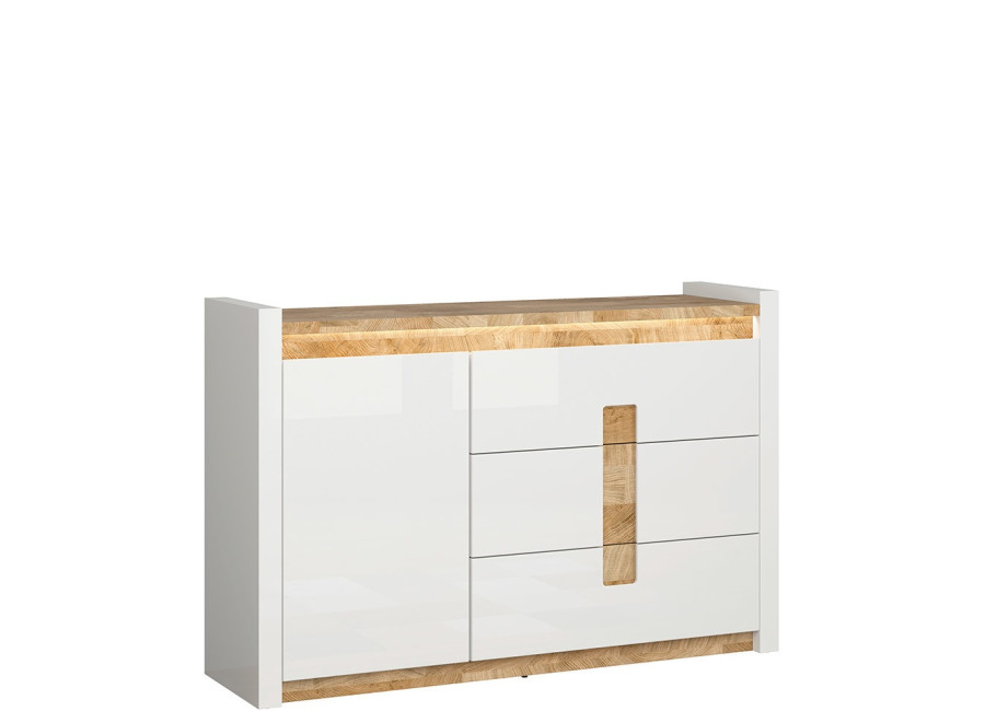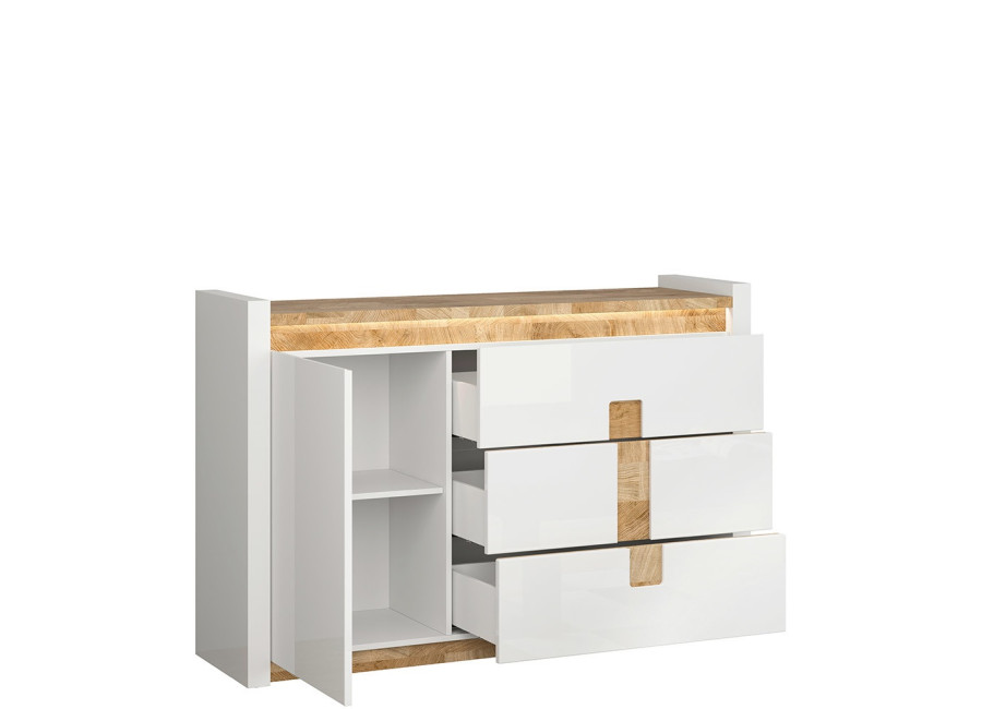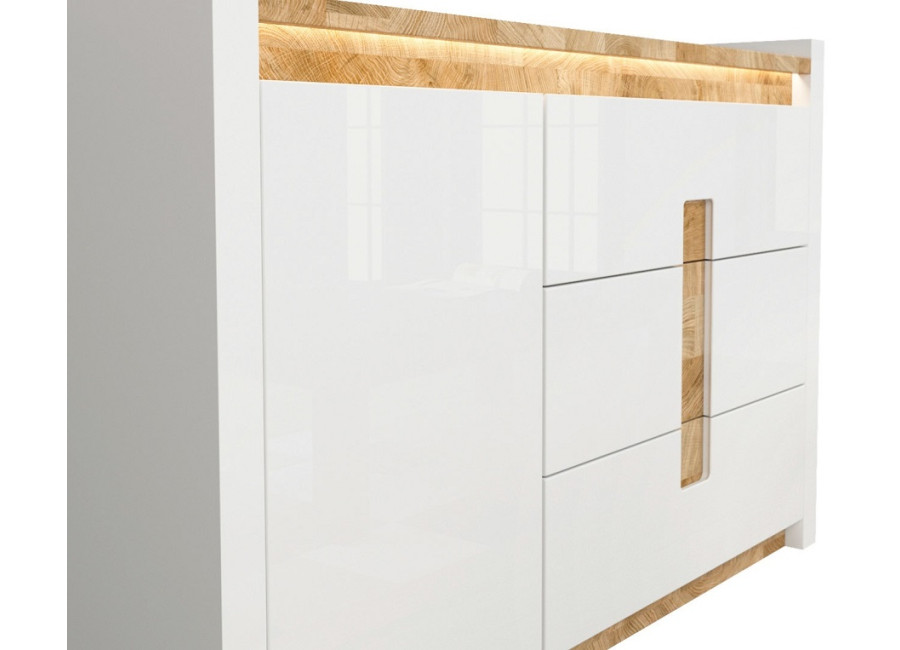 Nábytok ALAMEDA má moderný dizajn. Biela farba dvierok a korpusu je príjemne kombinovaná s doplnkami vo farbe a vzore dreva. Horná doska je podsvietená LEDkou.