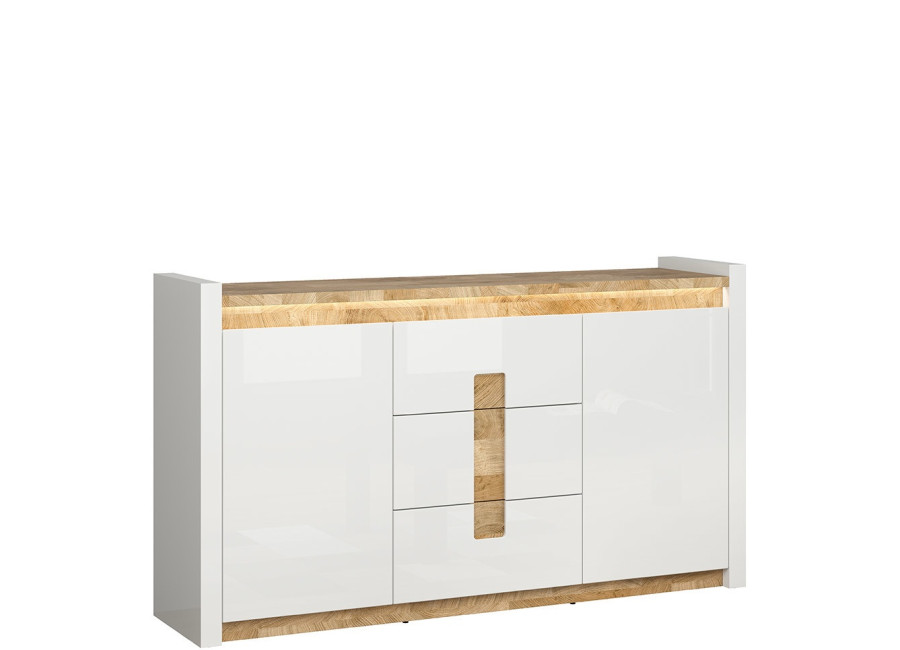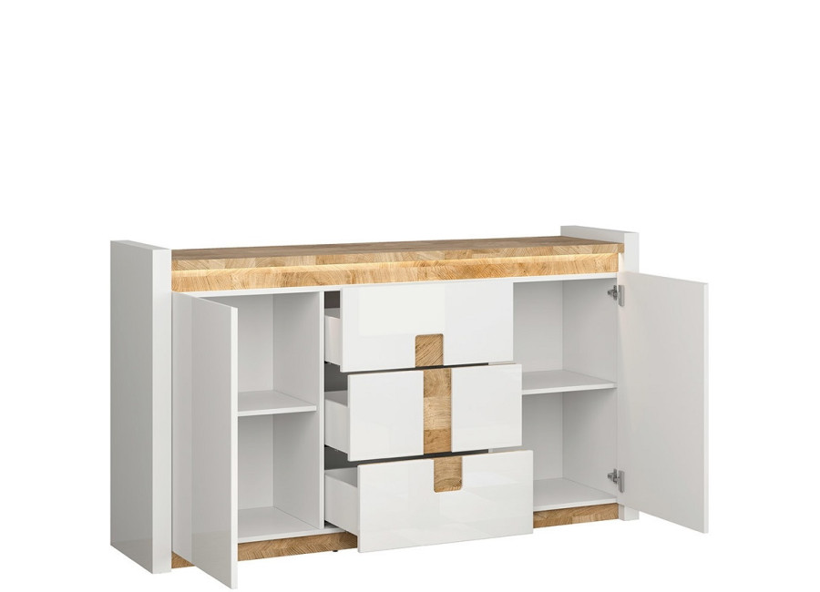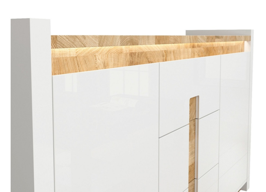 Nábytok ALAMEDA má moderný dizajn. Biela farba dvierok a korpusu je príjemne kombinovaná s doplnkami vo farbe a vzore dreva. Horná doska je podsvietená LEDkou.