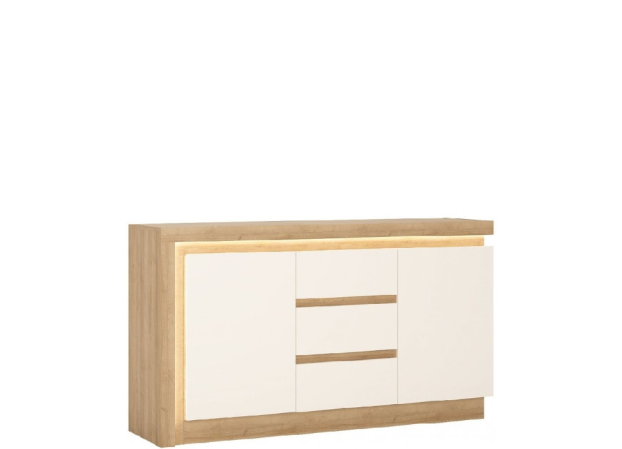 Charakteristickou črtou nábytku Leonardo/Lyon je LED podsvietenie horných okrajov niektorých skriniek. Farebné prevedenie dub riviera svetlý/biely lesk vytvorí v obývacej izbe príjemnú atmosféru.