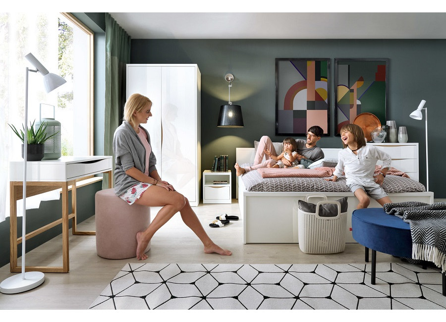 Spálňový nábytok PORI má príjemnú farebnú kombináciu bieleho lesku s dubom poľským. Charakteristickým prvkom sú zafrézované otvory slúžiace ako úchytka.
