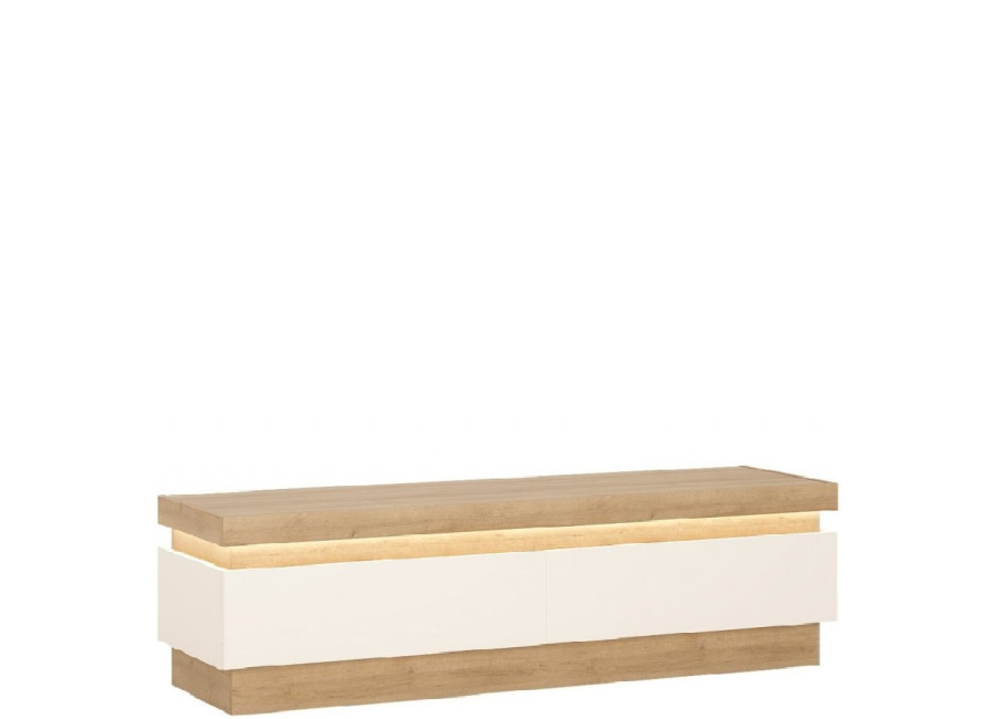 Charakteristickou črtou nábytku Leonardo/Lyon je LED podsvietenie horných okrajov niektorých skriniek. Farebné prevedenie dub riviera svetlý/biely lesk vytvorí v obývacej izbe príjemnú atmosféru.