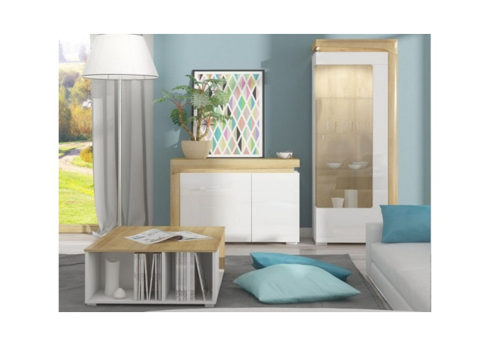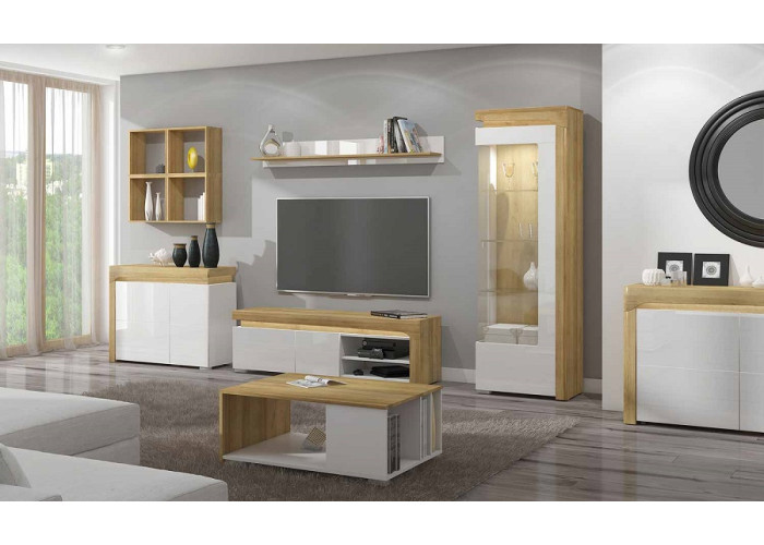 Nábytok THEO je moderná a elegantná kolekcia, ktorou si môžete zariadiť obývaciu izbu alebo jedáleň. Biele lesklé dvierka príjemne ladia s farbou dubu riviéra. Nábytok sa vyrába z kvalitnej laminovanej drevotriesky a MDF prednými plochami.