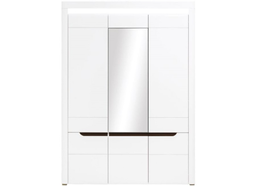 Skriňa IRMA IM14 je priestranný a elegantný kus nábytku, ktorý sa výborne hodí do spálne, obývačky aj predsiene a ponúka praktické riešenie pre prehľadné uloženie oblečenia aj doplnkov. Jej vnútorný priestor je rozdelený na dve časti – na jednej strane sa nachádzajú police na drobnejšie oblečenie a doplnky, na druhej strane priestor s dvoma šatníkovými tyčami na kabáty či košele. Dominantným prvkom je zrkadlo umiestnené na stredných dverách, ktoré opticky zväčšuje priestor a zároveň vnáša do interiéru viac svetla. Komfort používania zabezpečuje systém tichého dovierania dvierok a úsporné LED osvetlenie horného venca, ktoré zvýrazňuje moderný vzhľad skrine.