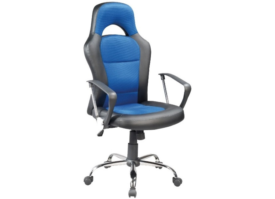 Moderné kancelárske kreslo S-033 čierno-modrá s pohodlným sedením. Je vyrobené z čiernej ekokože a modrej membránovej látky v kombinácií s plastovými a chrómovými doplnkami. Kreslo je možné výškovo nastaviť mechanizmom TILT.