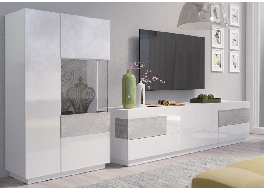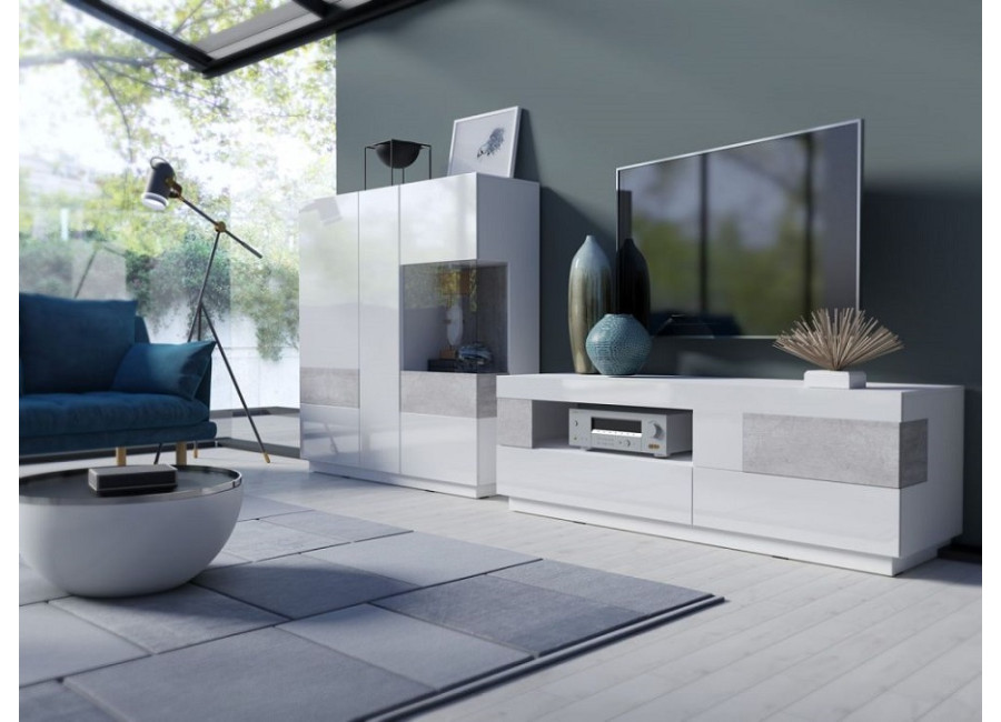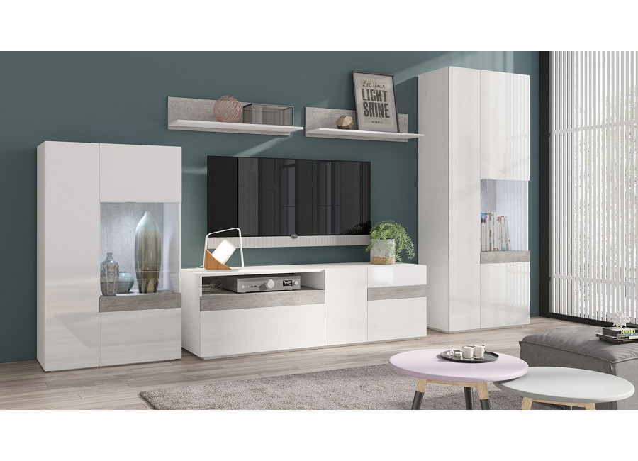 Nábytok STACEY je vhodný do moderných obývacích izieb. Farebná kombinácia farieb: biely lesk a Colorado beton vytvorí v miestnosti príjemnú atmosféru. Vyberte si zo sektorových skriniek a zariaďte si obývaciu izbu moderne a štýlovo.