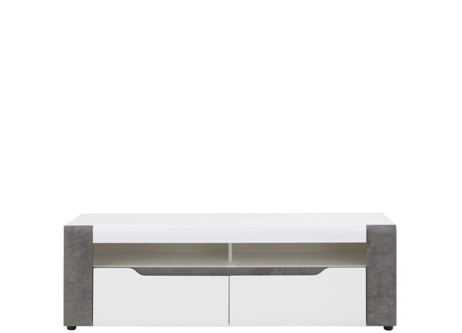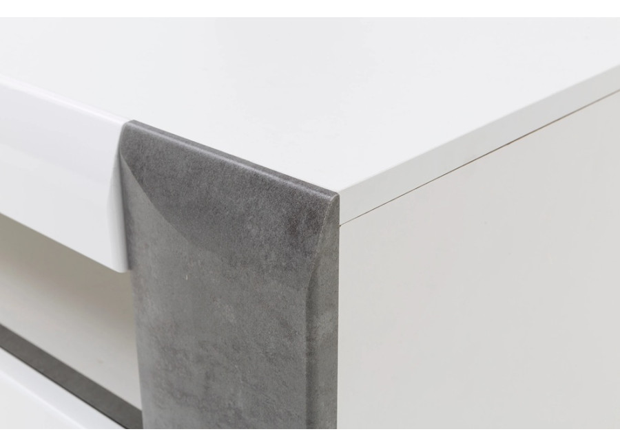 Skrinka pod TV Brando B01 zaujme moderným dizajnom, výraznou farebnou kombináciou a čistými líniami. Vďaka spojeniu bieleho lesku a dekoru betónu pôsobí elegantne a zároveň mierne industriálne. Skvele sa hodí do obývačky alebo dennej miestnosti, kde vytvára štýlové miesto pre televízor aj ďalšiu elektroniku a zároveň prirodzene dopĺňa moderný interiér.