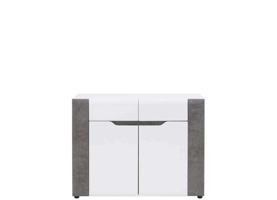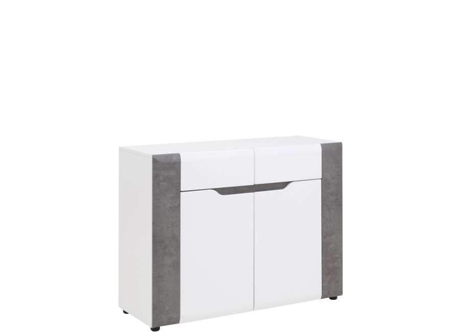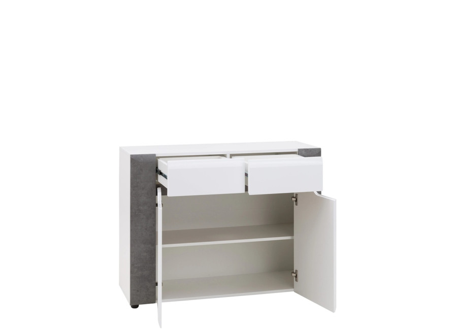 Komoda Brando zaujme moderným vzhľadom, výraznou farebnou kombináciou a jednoduchým, čistým dizajnom. Vďaka spojeniu bieleho lesku a dekoru betónu pôsobí elegantne a zároveň moderne, takže sa skvele hodí do obývačky, spálne aj domácej pracovne. Je praktickým kusom nábytku, ktorý poskytuje dostatok priestoru na uloženie oblečenia, dokumentov alebo rôznych drobností. Komoda ponúka prehľadne riešený úložný priestor, v hornej časti sa nachádzajú dve zásuvky a pod nimi skrinka s policou. Dvierka sú vybavené pántmi so systémom tichého dovierania.