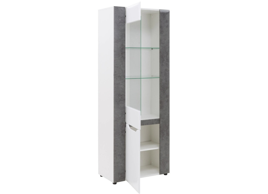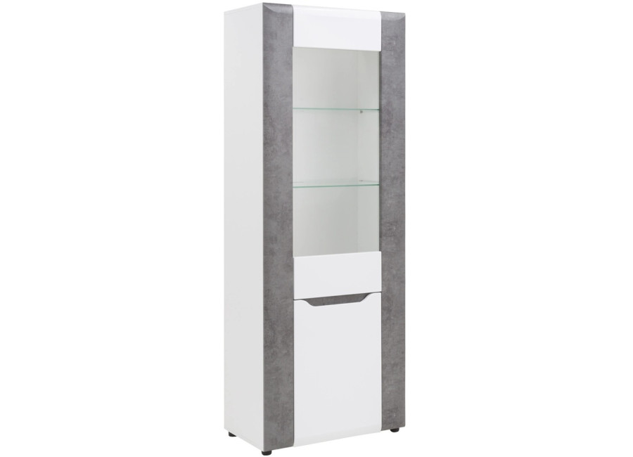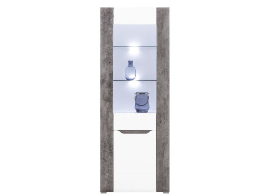 Vitrína Brando zaujme moderným vzhľadom, elegantnou farebnou kombináciou a jednoduchými líniami. Spojenie bieleho lesku a dekoru betónu dodáva nábytku moderný, mierne industriálny charakter, ktorý krásne vynikne v obývačke alebo jedálni. Horná časť vitríny je presklená a doplnená o LED osvetlenie, vďaka čomu je ideálna na vystavenie dekorácií alebo obľúbených predmetov.