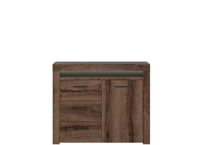 Nábytok BAYLAR má elegantnú farbu dub monastery kombinovanú s čiernymi úchytkami. LED osvetlenie vytvorí v izbe príjemnú atmosféru.