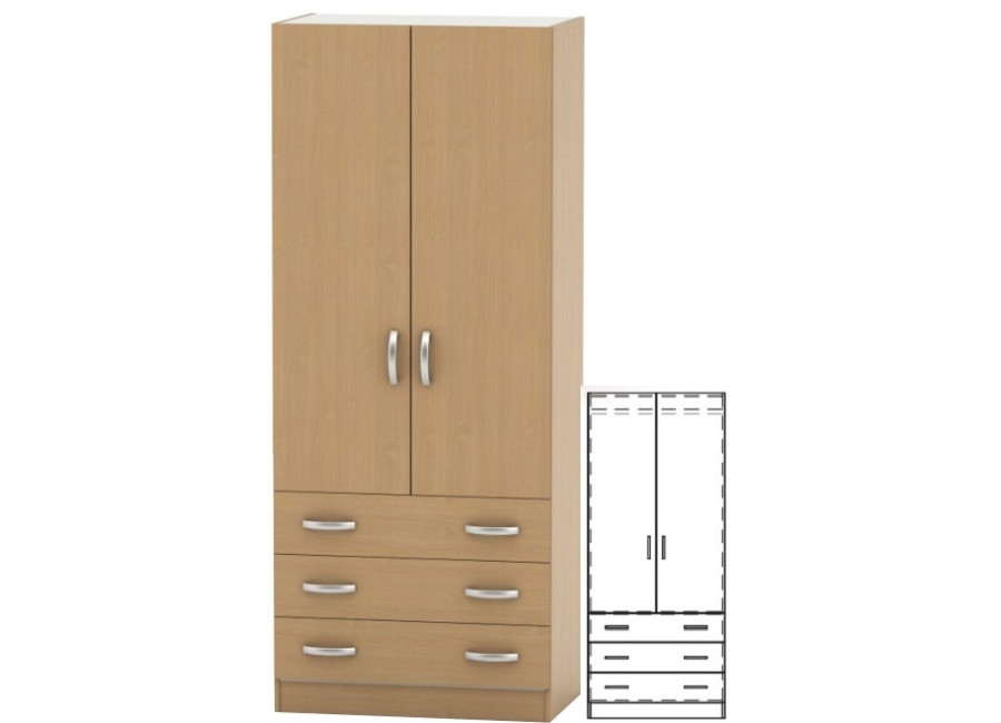 Zásuvková skriňa BETTY BE02-001-00 s dvomi dverami je určená do každej miestnosti - do spálne, do obývačky, do detskej izby, do predsiene alebo do haly. V spodnej časti skrine sú umiestnené tri praktické zásuvky. Vnútro skrine a zásuviek sú v bielom prevedení. Vešiakovo-zásuvková skriňa je vyrábaná v dezéne buk. Moderný vzhľad zásuvkovej skrine dopĺňajú strieborné úchytky BETTY umiestnené na zásuvkách po oboch krajoch skrine.