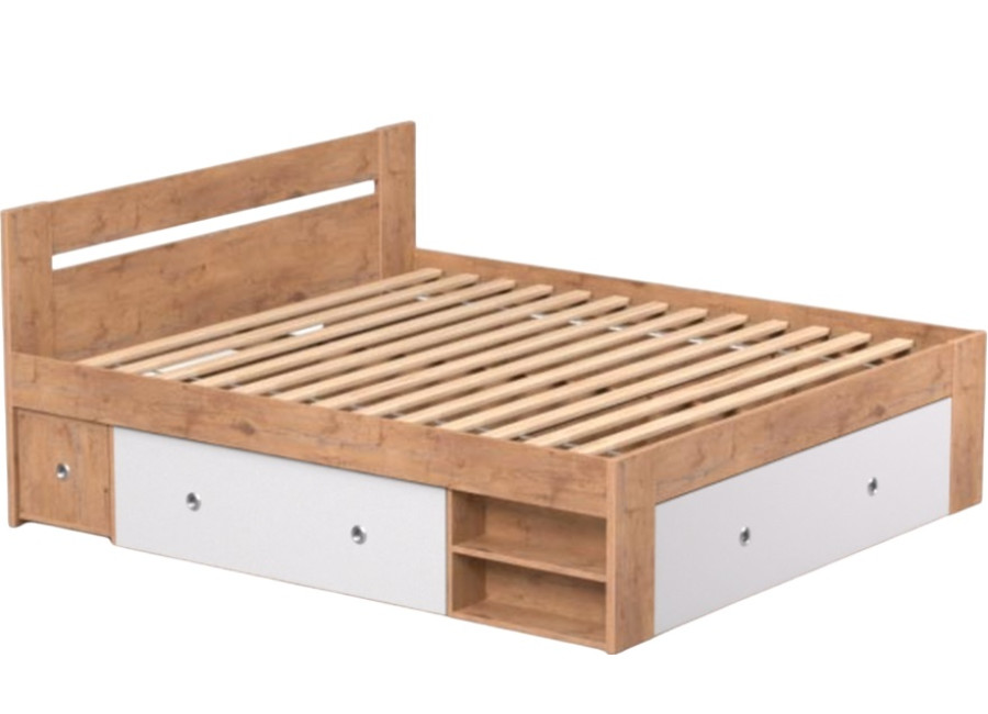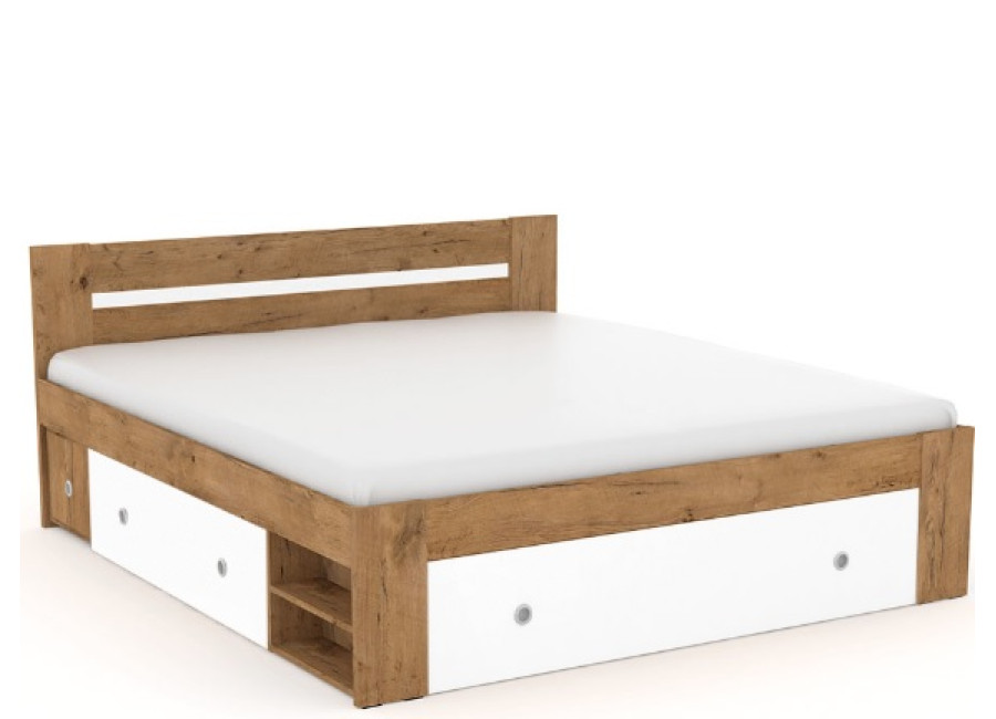 Manželská posteľ zahŕňa: korpus postele + 2ks výsuvných nočných stolíkov + 3 ks výsuvných úložných priestorov + 2 ks odklacích políc.