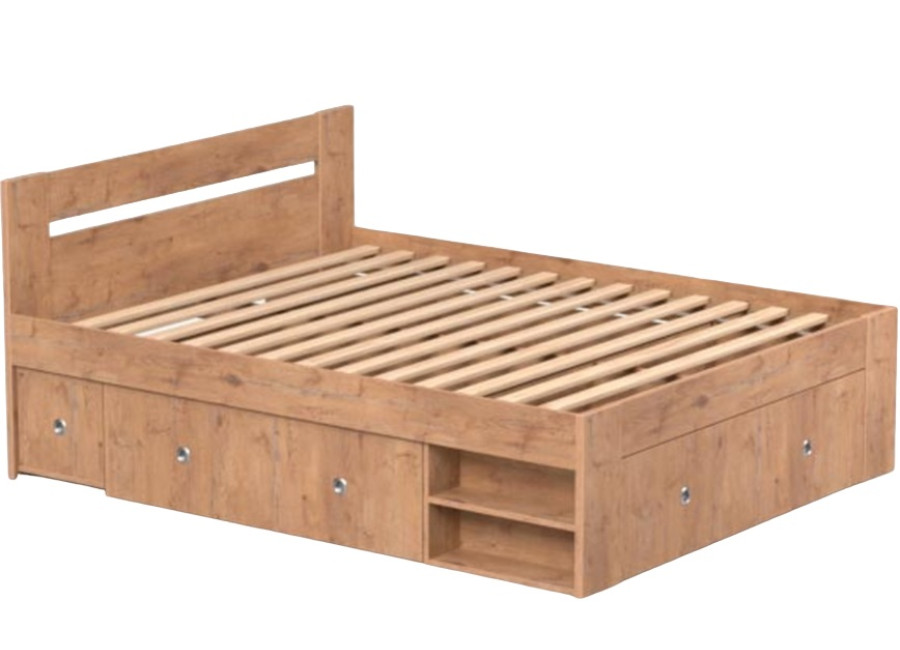 Manželská posteľ zahŕňa: korpus postele + 2ks výsuvných nočných stolíkov + 3 ks výsuvných úložných priestorov + 2 ks odklacích políc.