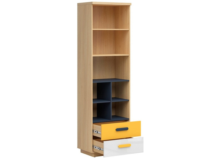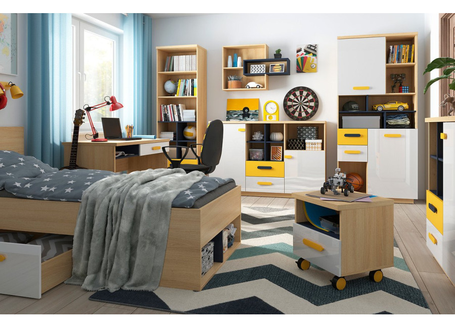 Detskou kolekciou WESKER vytvoríte interiér plný farieb a praktického nábytku. Jednoduché geometrické tvary, biely lesk dvierok doplnený žltou a granátovou, vyhovejú vkusu dievčat aj chlapcov.