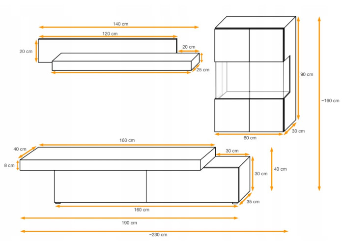 - TV stolík: 40cm x 170cm x 40cm