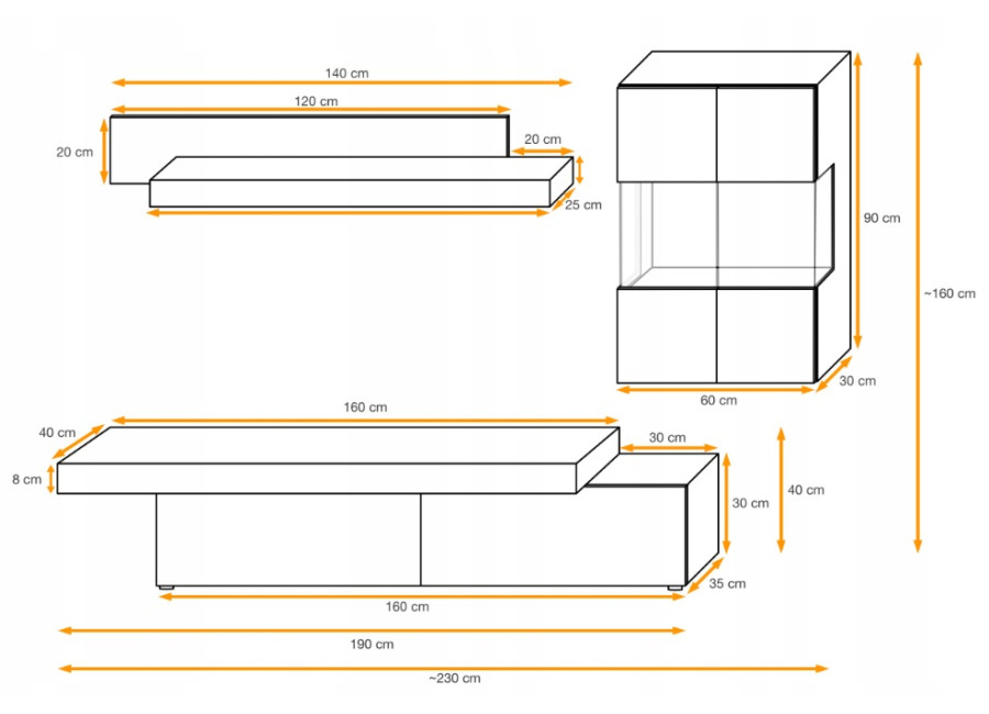 - TV stolík: 40cm x 170cm x 40cm