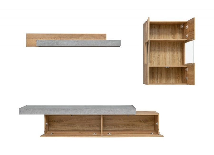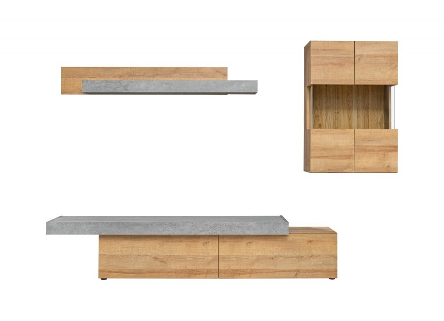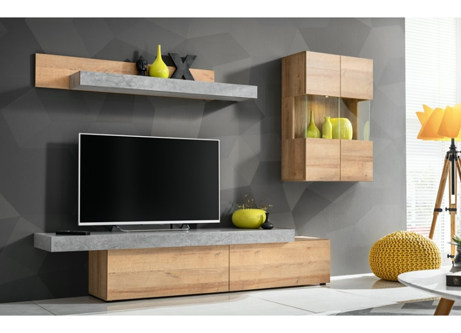 Obývacia stena CONCRET sa skladá z TV stolíka, vitríny a závesnej police.